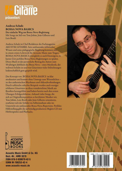 Andreas Schulz ist Chefredakteur der Fachmagazine AKUSTIK GITARRE und ACOUSTIC PLAYER. Sein umfassendes stilistisches Wissen und seine pädagogische Begabung kommen nun in einem Lehrwerk für Acoustic Music Books zum Tragen: BOSSA NOVA BASICS ermöglicht es auch Einsteigern, in kurzer Zeit perfekte Bossa-Nova-Begleitungen zu spielen. Dieses Buch ist der persönliche Beitrag des Autors zum 50-jährigen Jubiläum des Bossa Nova – eines Musikstils, der weltweit beliebt ist und von Gitarristen vieler Stilrichtungen leidenschaftlich gern gespielt wird.
